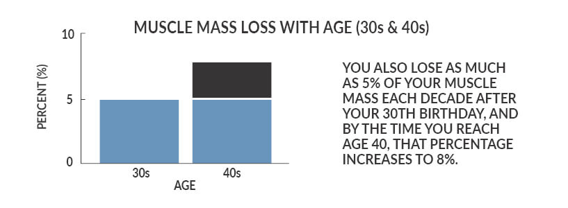 Maintaining a healthy weight and adequate muscle mass is at the base of your physical wellness. But as you age, it becomes more difficult to maintain your optimal weight. After age 30, your metabolic rate drops about 1% every year. At the same time, you lose as much as 5% of your muscle mass each decade after 30. Once you reach 40, this loss jumps to 8%.