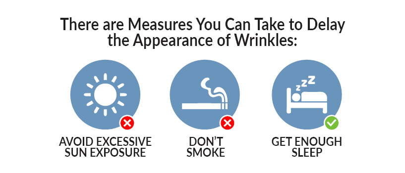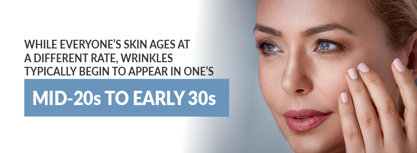 First, keep in mind that wrinkles are a natural part of the aging process. With time, skin loses its elasticity and becomes more fragile. And while everyone’s skin ages differently, wrinkles usually begin to show up in your mid-20s to early 30s.